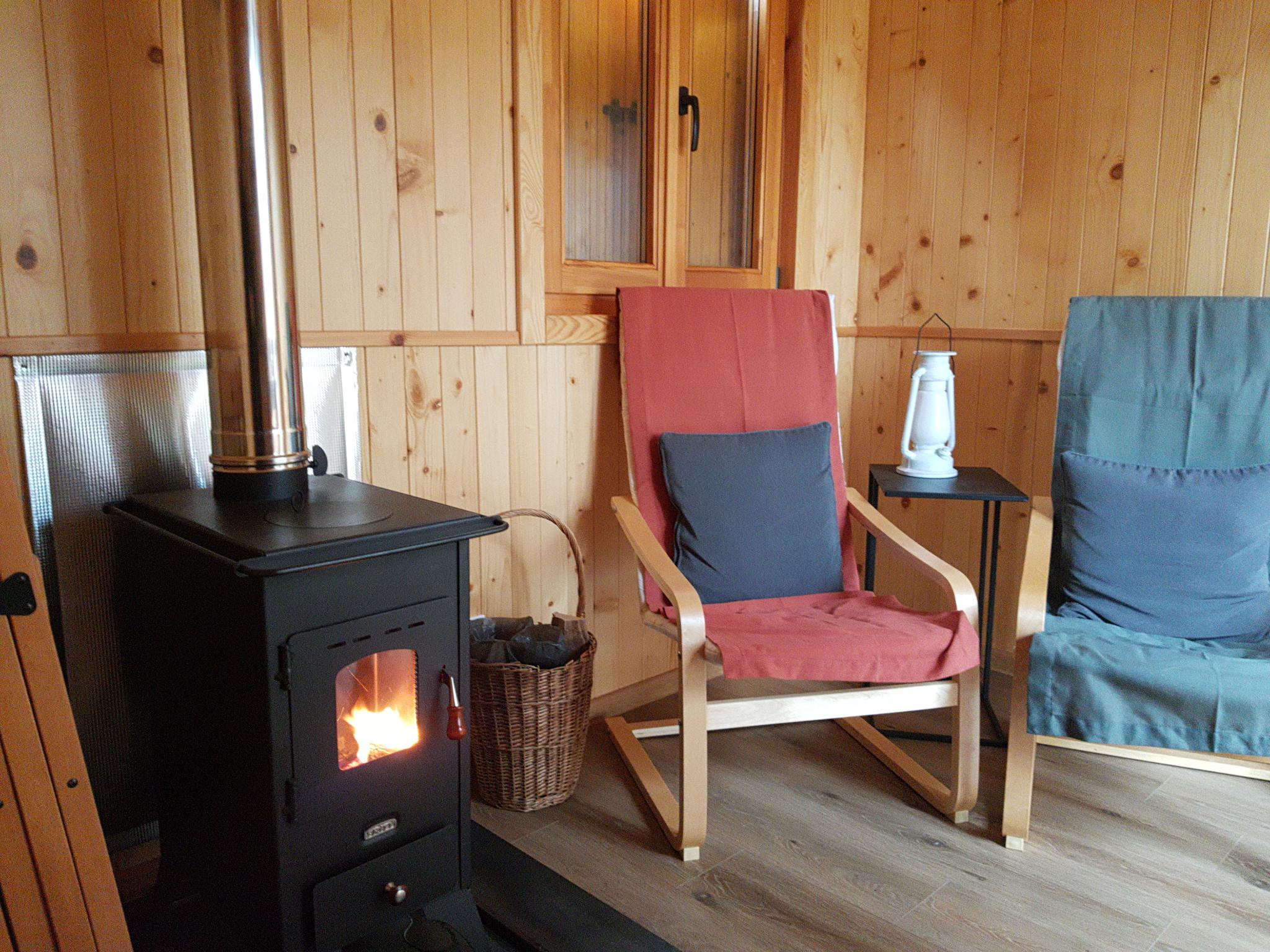La roulotte est autonome, avec des panneaux photovoltaïques, une cuve d’eau pour la douche et les éviers, une toilette sèche et un poêle à bois.